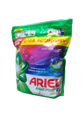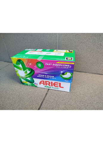Капсули Ariel All in 1 Color , 22 шт. забезпечать комплексне прання та очищення від забруднень. Призначені для прання кольорового одягу. Чому прання з Ariel Pods вигідно?: - видаляє плями уже після першого використання. - заощаджуйте до 60% енергії під час кожного прання,та зменшуйте викиди СО2 у вашій білизні. - делікатний вплив на тканину.захищаючи її. - продовжуйте насолоджуватись свіжим ароматом довше. - можна використовувати при температурі від 20 до 95С на вагу одягу 4-5 кг. У разі великих забруднень використовувати 2 капсулки. А чи знали ви,що від температури прання вигляд та стан вашої білизни залежить на 60%. Протипоказано використовувати капсулки для вовни, шовку, замочування, та ручного прання. Виготовлено в Італії.