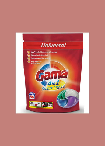 Тепер Вам не потрібно купувати пральний порошок, ополіскувач для білизни, засіб для виведення плям і засіб для захисту пральної машини. Достатньо всього 1 капсули Gama. Завдяки високій концентрації, при вазі всього 26 г, 1 капсула замінює: 65 г прального порошку, 25 г кондиціонера, 15 г засобу для виведення плям і 12 г антикальку, і економить Ваш бюджет. Gama 4in1 Universal підходить для всіх типів тканин. Особлива покращена формула гель-капсул перешкоджає утворенню катишків та вимиванню кольору з одягу. Тому Ваші речі довше залишаються новими. Зверніть увагу! Необхідно окремо прати кольорові, білі та чорні речі, щоб уникнути фарбування речей.