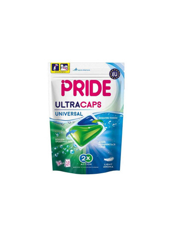 Капсула складається з двох активних компонентів, які, завдяки своїй активній формулі, ефективно видаляють сильні забруднення на білих і кольорових тканинах, водночас захищають тканини від передчасного знебарвлення. Капсули дуже прості у використанні — необхідну кількість засобу вже дозовано в капсулі. У складі капсул Pride Ultra містяться ензими, які допомагають впоратися із застарілими плямами. Засіб підходить для повсякденного прання, ефективно видаляє плями будь-якої складності — жиру та інших типів забруднень. Капсули Pride Ultra швидко розчиняються у воді та не залишають плівку після прання.