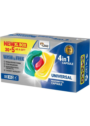 Це 4-х камерні капсули для прання 4 в 1: 1. Потужне видалення плям. Підсилена формула виведення плям завдяки вмісту марсельського мила. Капсули глибоко проникають у волокна та видаляють навіть найскладніші плями. 2. Пом’якшення. Капсули «Wash&Free» дарують білизні м’якість та роблять речі приємними на дотик. 3. Максимальна свіжість. Неприємні запахи ефективно нейтралізовані, тому можна насолоджуватися довготривалою свіжістю білизни. 4. Захист кольору. Капсули забезпечують яскравість одягу навіть після декількох циклів прання. Господарське мило, яке є у складі цих капсул, підсилює дію плямовивідника. Безпечні для навколишнього середовища. Інноваційна плівка повністю розчиняється у воді, вивільняючи неймовірну силу капсули. Не рекомендується для прання виробів з вовни та шовку.