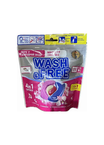Капсули для прання WASH & FREE - 4-х камерні капсули для прання 4 в 1: Видалення плям: завдяки унікальному складу, капсули глибоко проникають у волокна і видаляють навіть найскладніші плями. Пом'якшення: капсули дарують білизні м'якість і роблять речі приємними на дотик Максимальна свіжість: неприємні запахи ефективно нейтралізовані, тому можна насолоджуватися тривалою свіжістю білизни Захист кольору: капсули забезпечують яскравість одягу навіть після кількох прань Не рекомендується для прання виробів із вовни та шовку. Зверніть увагу: Тримайте пакування закритою після використання. Не проколювати, не розривати, не розрізати капсули. Брати сухими руками. Не використовувати програму попереднього полоскання. Для прання при низькій температурі не обирайте програму для делікатних тканин. Не класти у лоток для порошку або сушильну машину. Не перевантажувати пральну машину. Не використовувати для миття рук та замочування. Зберігати в місцях, недоступних для дітей. Викликає подразнення шкіри та очей. У разі попадання в очі необхідно промити великою кількістю проточної води. При попаданні в шлунок – викликати блювоту, звернутися до медустанови (медзакладу). Вага 1 капсули: 23.5 г