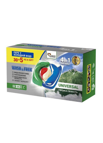 Чотирьох компонентні капсули для прання WashFree «Гірська свіжість»- це ефективний сучасний засіб для прання як білих, так і кольорових тканин. Засіб діє м’яко та комплексно, очищає тканину від широкого спектру забруднень, Зберігає колір та дарує вашим речам неповторний аромат чистоти та свіжості гірського повітря.