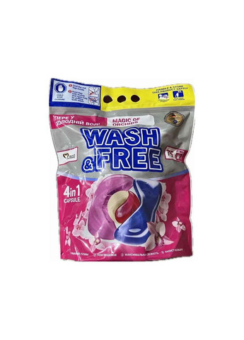 Чотирьохкомпонентні капсули для прання Wash&Free "Магія орхідей" — це ефективний сучасний засіб для прання як білих, так і кольорових тканин, який наповнений особливим квітковим ароматом. Засіб діє м'яко та комплексно, очищає тканину від широкого спектру забруднень, зберігаючи насиченість та яскравість кольорів.