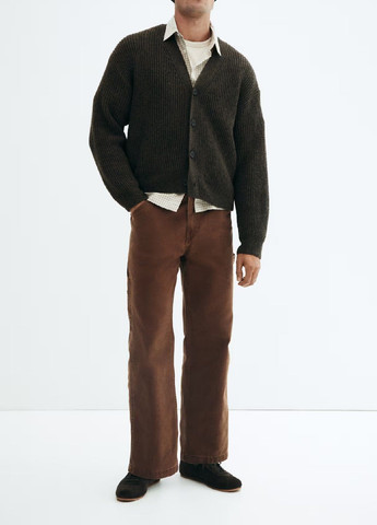 Кардиган ребристої в'язки з глибоким V-подібним вирізом та застібкою на гудзики спереду. Вільний крій, вільний, але не об'ємний.