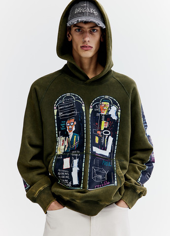 Basquiat x Ev Bravado & Téla D'Amore x H&M. У цій спільній дизайнерській колекції знакова робота Баскія поєднується з майстерністю дизайнерського дуету Ев Бравадо та Тели Д'Аморе. Ця кепка виготовлена з бавовняного деніму та має вишивку спереду та ззаду. Прикритий ґудзик у верхній частині, використані деталі на козирку та регульований пластиковий ремінь на шиї. Бавовняний твіловий ремінець. Колекція, яка завдяки своєму вражаючому дизайну та безпомилковому мистецтву Баскія запрошує вас продемонструвати свою індивідуальність. Можливо пошкоджена бірка.