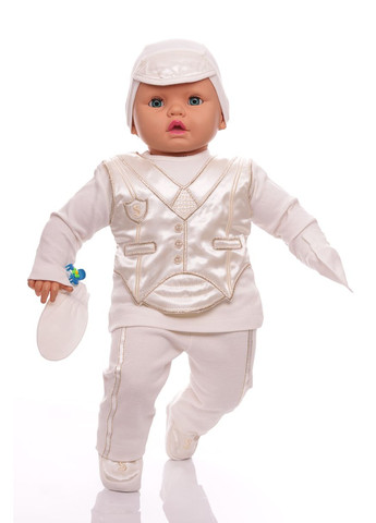 костюм хрестинний Відмінний варіант на свято. Ошатний, красивий і зручний. Тканина трикотаж інтерлок -100% бавовна Прикрашений жилетом-обманкою У комплекті входить: -кофточка -штанішкі -шапочка -царапкі -пінеткі Дуже стильно виглядає на діток. Дуже добре підходить на подарунок. Розмір 62 см. Виробник Туреччина. Виміри Розмір А - Окружність голови см B - Довжина виробу від плеча см С - Напівобхват грудей см D - Довжина рукава від коміра см F - Довжина по шаговому шву см G - Напівобхват талії см I - Довжина виробу від пояса см W - Довжина стопи см 62 36 27 23 27 17 19 33 9 Таблиця віку Розмір Вік 62 от 0м до 3м