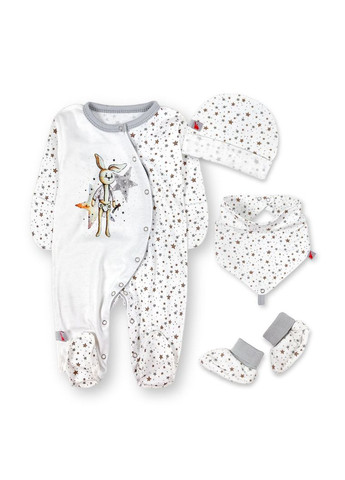 Ми знаємо, наскільки важливо мати зручний і практичний одяг для малюків. І саме тому ми сформували цей комплект, який складається з трикотажного чоловічка, шапочки, слинявчика та пінеток. Чоловічок виготовлений з м'якого і дихаючого інтерлоку, що забезпечить комфорт крихітці протягом дня. Він має зручну застібку на кнопки, що розташовані в дві ніжки. Шапочка також виготовлена з трикотажу і має м'яку та еластичну тканину, яка ніжно огортатиме голову малюка. Вона добре тримається на голові і захищатиме від холоду та вітру. Слинявчик допоможе захистити одяг малюка від слини та залишків їжі. Він має зручну застібку і тримач під гризунець. Пінетки забезпечать малюку тепло та комфорт на ніжках. Вони виготовлені з інтерлоку і мають еластичний манжетик, що дозволяє їм добре триматись на ніжках малюка. Цей комплект є чудовим вибором для молодих батьків, які шукають зручний та практичний одяг для своїх малюків. Він допоможе зберегти одяг малюка в чистоті та забезпечить йому комфорт протягом дня.