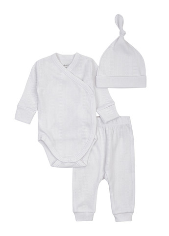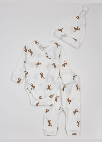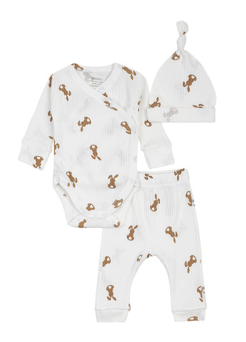 Ніжний комплект із фактурної бавовни для новонародженого: боді на запах, штанці та шапочка-вузлик Цей комплект у молочному кольорі з милим принтом бежевих зайчиків створений для максимального комфорту з перших днів життя. М’яка фактурна тканина, зручний крій та приємні деталі — усе продумано для малюка. У комплект входить: боді на запах із довгими рукавами штанці з м’яким поясом шапочка-вузлик у тон Тканина: Зовні — фактурна смугаста поверхня, що додає комплекту стилю й об’єму. Внутрішній шар — гладкий і м’який, ніжний до шкіри новонародженого. Принт: Бежеві зайчики на молочному фоні — ніжний, універсальний візерунок для перших образів. Захист від подряпин: У боді для розмірів до 3 місяців передбачені антицарапки — відвороти на рукавах, що оберігають дитину від випадкових рухів ручками. Зручність у щоденному використанні: Боді легко вдягати завдяки застібці на запах, штанці не тиснуть на животик, а шапочка м’яко фіксується на голові. Безпечні матеріали: Тканина сертифікована за стандартом OEKO TEX Standard 100 — гіпоалергенна, безпечна та приємна на дотик. Комплект ідеально підходить: для пологового будинку на виписку для фотосесії для щоденного використання