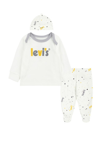 Дитячий комплект Levi´s. Комплект із трьох предметів, необхідний для будь-якого дитячого гардеробу, ідеально підходить як для відпочинку, так і для ігор. У комплекті кофта з довгим рукавом, штанці та шапочка. Кофточка лонгслів з логотипом бренду спереду. Круглий виріз, довгі рукави без застібки. Штанці з еластичного матеріалу, закритий носок. Шапочка з невеликим підворотом із легкої бавовни. Логотип бренду по центру відвотору. Принт по всій поверхні штанців та шапочки. Дуже м'який матеріал комплекту. Відмінна якість.