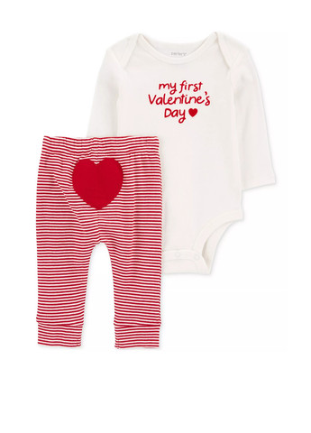 Дитячий комплект Valentine´s Day Carter´s. Цей чарівний комплект складається з боді та штанців. Боді з довгим рукавом та круглим вирізом. На рукавах відвертаються рукавички-антицарапки. Знизу застібка на кнопки для зручності перевдягання. Спереду бархатистий напис My first Valentine's Day. Штанці з еластичною гумкою на поясі. Спереду декоративні гудзики. Принт — горизонтальна смужка і мила аплікація у вигляді серця ззаду. М'який та приємний до тіла натуральний матеріал комплекту. Відмінна якість.