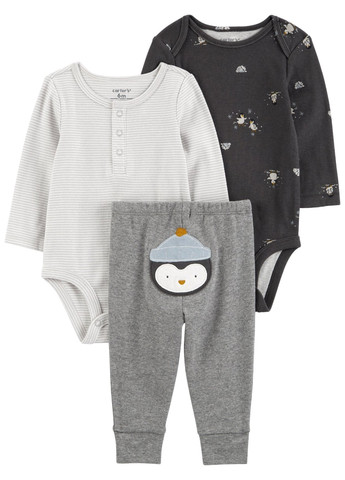 Дитячий комплект Carter´s. Комплект складається з двох боді та штанів. Боді з довгим рукавом і круглим вирізом. Застібаються знизу на кнопки. Один з боді з принтом пінгвінів по всій поверхні. Другий - у горизонтальну смужку та із застібкою-поло на три кнопки зверху. Штани з еластичним поясом і манжетами, ззаду нашивка - пінгвін. Дуже м'який та приємний до тіла матеріал комплекту. Відмінна якість.