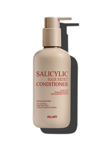 Salicylic Hair Reset Conditioner – глибоке відновлення довжини волосся з дерматологічним підходом. Завдяки комбінації заспокійливих та реструктуруючих компонентів, засіб забезпечує м’якість, блиск і еластичність навіть сухим і пошкодженим ділянкам волосся. Завдяки гідролізованому рисовому протеїну та гліколевій кислоті, кондиціонер сприяє поліпшенню розчісування на 92% та зниження ламкості 66%. Формула збагачена гідролізованими білками рису та насіння коноплі, які діють як реструктуризуючі агенти – проникають у стрижень волосини, заповнюючи порожнечі й ущільнюючи структуру. М’яка силіконова основа створює невагому захисну плівку, що пригладжує кутикулу, надає дзеркального блиску та захищає від термічного і механічного пошкодження. Кокосова олія та гліцерин активно зволожують і пом’якшують, повертаючи волоссю еластичність і гладкість. Саліцилова та гліколева кислоти у складі кондиціонера делікатно полірують та оздоровлюють довжину волосся, надаючи йому гладкість, блиск і легкість, зменшуючи ламкість, запобігаючи накопиченню важких речовин і покращуючи ефективність зволожувальних компонентів. Кондиціонер не обтяжує волосся, полегшує розчісування та усуває тьмяність, захищаючи довжину від сухості, ламкості та посічених кінчиків. Ідеальний для тьмяного, пористого, втомленого волосся, яке потребує оновлення. Кондиціонер забезпечує шовковисту та гладку текстуру волосся, знижуючи ламкість і посічення. Він полегшує розчісування та інтенсивно живить волосся, не обтяжуючи його. Помітне ущільнення та блиск з'являються вже після першого використання, надаючи волоссю здоровий вигляд і природний блиск, а регулярне використання кондиціонера запобігає пересушуванню, тьмяності та пушінню. Спосіб застосування: після миття шампунем нанести кондиціонер на вологе волосся, уникаючи зони коренів. Рівномірно розподілити по всій довжині, приділяючи особливу увагу кінчикам. Залишити на 3-5 хвилин для глибшого впливу, після чого ретельно змити водою. Підходить для регулярного використання після кожного миття. Застереження Можлива індивідуальна чутливість до компонентів продукту. Перед використанням рекомендовано зробити тест на алергічну реакцію на невеликій ділянці шкіри. Уникати контакту з очима.