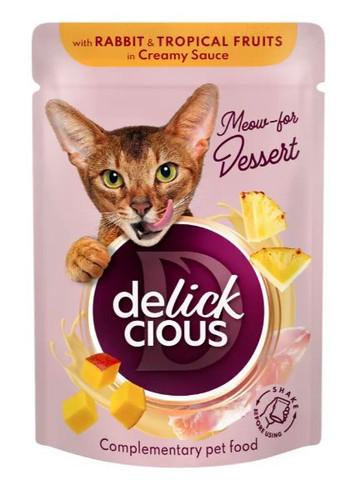 Вологий корм для котів Delickcious пластівці з кроликом та тропічними фруктами у вершковому соусі 80 г D6251501 Вологий корм для котів Delickcious пластівці з кроликом та тропічними фруктами у вершковому соусі 80 г D6251501 — це вишуканий вологий корм для дорослих кішок, який поєднує ніжне м'ясо кролика, аромат тропічних фруктів та шовковистий вершковий соус. Такий гастрономічний мікс не тільки порадує смакові рецептори вашого вихованця, але й забезпечить його всіма необхідними поживними речовинами для здоров'я та активності. Переваги: М'ясо кролика: є джерелом білка, підтримуючи м'язову масу та загальний тонус організму. Тропічні фрукти: манго та ананас збагачують раціон вітамінами та антиоксидантами, сприяючи зміцненню імунної системи. Вершковий соус: надає корму ніжну текстуру, покращує поїдання та підходить навіть для вибагливих кішок. Збалансований склад: корм містить вітаміни, мінерали, таурин, які підтримують здоров'я серця, стан шкіри та блиск вовни. Склад: М'ясо та продукти тваринного походження (у тому числі кролик не менше 10%), фрукти (манго, ананас), злаки, молочні продукти, вітаміни, мінерали, натуральні антиоксиданти. Рекомендації з годівлі: Підходить для повсякденного харчування дорослих кішок. Можна використовувати як самостійний раціон або як доповнення до сухого корму. Важливо забезпечити кішці постійний доступ до свіжої води. Вологий корм для котів Delickcious пластівці з кроликом та тропічними фруктами у вершковому соусі 80 г D6251501 — це ідеальний вибір для власників, які хочуть подарувати своїм вихованцям корисне, натуральне та неймовірно смачне харчування!