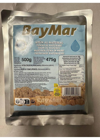 Тунець іспанський великими шматками BayMar. Півкілограмова упаковка. Інгредієнти: тунець 95% і 5% соняшникової олії для того, щоб не було пересихання продукту. Великі шматки, у власному соку, збагачений на Омега-3-поліненасичені жирні кислоти. Тунець продається в герметичному, щільному пакеті. Міцна фольга не пропускає повітря і захищає продукт від променів сонця. Харчова інформація на 100 г: 15 г жирів, 3 г з яких насичені. 21 г протеїнів і 2 г солі. Морська риба містить максимальну кількість вітамінів, мінералів і необхідних мікроелементів, потрібних організму будь-якої людини. М’ясо тунця не тільки дуже смачне, але і корисне.