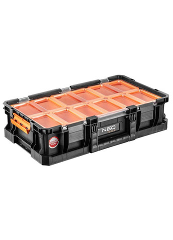 Модульний органайзер NEO (арт. 84-060) — зручне рішення для зберігання та транспортування невеликих аксесуарів і кріплень. Міцна кришка з полікарбонату захищає вміст від пилу та пошкоджень. Органайзер оснащений надійними поліамідними замками та ергономічною ручкою для зручного перенесення. У комплект входять 9 кошиків двох розмірів, які забезпечують впорядковане зберігання. Можливість комбінування з іншими модулями робить цей органайзер універсальним вибором як для домашнього використання, так і для професіоналів. Бренд NEO — гарантія надійності та якості.
