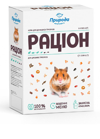Рецептура корму «Хом’ячок» розроблена на основі рекомендацій провідних фахівців з розведення дрібних гризунів. Корм має всі інгредієнти, необхідні для розвитку молодих тварин і для гарної кондиції дорослих. Крім зерна корм містить смакові добавки (горіхи), вітаміни (А, В1, В2, D3, Е, Н), а також мінеральні речовини (солі кальцію, фосфору, калію, натрію). Застосування: годувати 2-3 рази на день невеликими порціями. Корм кожного разу насипати у чисту суху годівничку. Обов'язково в поїлці повинна бути свіжа вода. Склад: овес, пшениця, кукурудза, трав’яне борошно гранульоване в асортименті, просо жовте, просо червоне, ячмінь, комбікорм, гречка, горохові пластівці, насіння соняшнику.