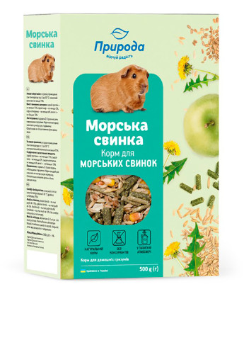 Рецептура корму «Морська свинка» розроблена на основі рекомендацій провідних фахівців із розведення гризунів. Повноцінний вітамінізований корм призначений для щоденного годування морських свинок та інших середніх гризунів. Він містить усі необхідні інгредієнти, які забезпечують правильний розвиток молодих та відмінну кондицію дорослих тварин. Корм сприяє поліпшенню стану вовни у ангорських та розеткових морських свинок. Крім зерна до складу суміші входять вітамінно-смакові добавки: горіхи, фрукти, вітаміни А, В1, В2, D3, E, H, Р, а також мінеральні речовини: солі кальцію, фосфору, калію, натрію. Застосування: годувати 2-3 десь у день невеликими порціями. Корм щоразу насипати в чисту суху годівницю.