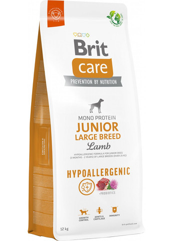 Гіпоалергенний корм Brit Care Dog Hypoallergenic Junior Large Breed для молодих собак (від 3 місяців до 2 років) великих порід (понад 25 кг) з ягнятком. Добре підходить також і для вихованців із чутливим травленням та схильністю до розвитку харчової алергії. Цей раціон включає пробіотики та антиоксиданти, що покращують роботу травної системи (балансують мікрофлору кишечника), що підвищують імунітет. Хондропротектори відіграють необхідну роль у формуванні та розвитку кісток, суглобів та хрящів. Сухий корм Brit Care суперпреміум класу зі збалансованим вмістом білків та жирів сприяє покращенню стану шкіри та вовни, остання стає м'якшою та блискучою. Склад: дегідрована ягнятина (42%), рис (35%), курячий жир, сушена м'якоть яблука, лососева олія (3%), пивні дріжджі, натуральний ароматизатор, гідролізовані дріжджі (0,5% - джерело інозиту та амінокислоти), 0 фруктоолігосахариди (230 мг/кг), хондроїтину сульфат (230 мг/кг), мананолігосахариди (180 мг/кг), юка Мохаве (181 мг/кг), насіння розторопші (110 мг/кг), β-глюкан мг/кг), обліпиха сушена (60 мг/кг), пробіотик Lactobacillus helveticus HA – 122 інактивовані (15х109 клітин/кг). Аналітичні компоненти: сирий протеїн 28,0%, сирий жир 16,0%, вологість 10,0%, сира зола 7,0%, сира клітковина 2,2%, кальцій 1,3%, фосфор 1,0%, натрій 0,4%, омега-3 жирні кислоти 2,0%, EПК (20:5-3) 0,05%, ДГК (22:6-3) 0,1%. Харчові добавки на 1 кг: вітамін А (3a672a) 23000 МО, вітамін D3 (3a671) 1700 МО, вітамін Е (3a700) 550 мг, вітамін С (3a312) 350 мг, таурин (3a370) 180 L-карнітин (3a910) 300 мг, вітамін B1 (3a821) 3 мг, вітамін B2 (3a825i) 11 мг, біотин (3a880) 4 мг, фолієва кислота (3a316) 1,4 мг, вітамін B6 (3a831)3a мг, ніацинамід (3a315) 38 мг, вітамін B12 0,12 мг, йод (3b201) 0,9 мг, органічний цинк (3b606) 100 мг, органічний марганець (3b50 45 мг, органічна мідь (3b406) 20 мг 8 (3b810) 0,18 мг. Містить схвалені ЄС антиоксиданти: екстракти токоферолу з олії (1b306(i)), аскорбілпальмітат (1b304) та екстракт розмарину. Енергетична цінність : 3850 ккал/кг Рекомендовані норми годівлі : Вага дорослого собаки, кг 25 30 40 50 60 70 80 90< Денна норма, г/день Вік, місяці 1-3 Цуценя 3-4 240 260 230 40 4-6 270 300 370 410 510 550 610 670 6-12 260 310 380 450 510 580 640 690 12-18 250 300 370 440 50 250 290 360 420 500 570 620 680 24-30 Доросла велика порода 420 480 540 600 650 30 < Доросла велика порода Рекомендований добовий раціон: дивіться на упаковці. *Інформація про інгредієнти та нутрієнтний склад корму для цуценят, норми годівлі на сайті є довідковою. Вся інформація про продукт представлена безпосередньо на пакованні. Щоб уникнути перегодівлі та можливого ожиріння, орієнтуйтеся на вказане виробником дозування у таблиці годівлі. Іноді норма може відрізнятись. Це може бути викликано умовами довкілля, способом життя та індивідуальними особливостями організму Вашого вихованця. Якщо Ви переводите Вашого чотирилапого друга на корм цієї марки з іншого, то рекомендується зміна живлення зробити плавним. Протягом семи днів поступово скорочуйте кількість старого корму та збільшуйте дозу нового. Зверніть увагу, що тварині потрібна свіжа вода. Фасування: 1 кг, 3 кг, 12 кг