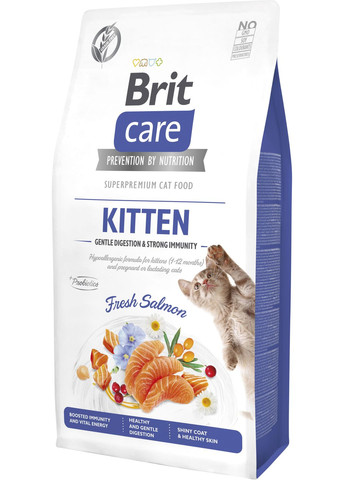 Гіпоалергенна рецептура зі свіжою куркою й індичкою для кошенят (1–12 місяців), а також для вагітних або годуючих кішок. Переваги корму: Беззернова рецептура з високим вмістом білка, жирними кислотами і молозивом для сильного імунітету і чутливого травлення Комплекс вітамінів і мінералів сприяє зміцненню скелета і зубів Таурин забезпечує правильну роботу серця, очей і мозку Корм для кошенят Brit Care Cat GF Kitten це: Зір і здоров'я серця. Рецептура з високим вмістом білка і додатковим таурином допомагає підтримувати зростання і розвиток м'язової маси, сприяє гарному зору і здоров'ю серця, а також дає енергію для нових відкриттів та ігор. Оптимальне поєднання вітамінів і органічних мікроелементів підтримує повсякденну активність і добре самопочуття. Здорове потомство. Оптимальний вміст кальцію, фосфору, магнію, вітаміну d, комплексу вітамінів, мінералів і незамінних амінокислот для повноцінної годівлі вагітних і годуючих котів забезпечує народження здорових кошенят і профілактику рахіту. Рецептура з високою засвоюваністю. Беззернова рецептура з високою засвоюваністю, багата на необхідні поживні речовини, покриває енергетичні потреби вагітних і годуючих кішок, а також підтримує розвиток кошенят під час вагітності. Пробіотики і пребіотики допомагають підтримувати нормальне здоров'я кишечника та імунної системи. Імунітет і здоровий розвиток. Молозиво містить імуноглобуліни – антитіла, які допомагають зміцнити імунітет кошеняти. Воно також містить речовини, які допомагають захистити новонароджене кошеня від вірусів і бактерій та зменшують виникнення алергічних реакцій. Склад: дегідратоване м’ясо індички (30%), свіже куряче м'ясо (26%), жир свійської птиці (консервований токоферолами, 12%), жовтий горошок (12%), нут (8%), масло лосося (3%), гідролізована печінка курки (2%), лляне насіння (2%), сушені яблука (2%), пивні дріжджі (1%), молозиво (0,5%), сушена ромашка (0,5%), мінерали, сушена обліпиха (0,3%), сушена журавлина (0,2%), фруктоолігосахаріди (0,025%), мананолігосахаріди (0,02%), юка Щидігера (0,01%), Lactobacillus acidophilus HA – 122 інактивовані (15x109 клітин/кг). Аналітичні компоненти: сирий протеїн 38,0%, сирий жир 18%, сира клітковина 1,5%, сира зола 7,2%, вологість 10,0%, омега-3 0,5%, омега-6 2,2%, кальцій 1,2%, фосфор 0,9%, натрій 0,5%, магній 0,1%. Харчові добавки на 1 кг: вітамін A (3a672a) 23000 МО, вітамін D3 (E671) 1000 МО, вітамін E (3a700) 800 мг, вітамін C (3a312) 400 мг, таурин (3a370) 2800 мг, L-карнітин (3a910 ) 100 мг, хлорид холіну (3a890) 2800 мг, біотин (3a880) 2,5 мг, вітамін B1 (3a821) 12 мг, вітамін B2 15 мг, ніацин (3a315) 60 мг, D-пантотенат кальцію (3a841) 50 мг , вітамін B6 (3a831) 12 мг, фолієва кислота (3a316) 3 мг, вітамін B12 0,05 мг, цинк (3b606) 140 мг, залізо (3b106) 55 мг, марганець (3b504) 65 мг, йодид калію (3b201) 4,5 мг, мідь (3b406) 12 мг, селен (3b8,10) 0,2 мг, L-метіонін (3c305) 2500 мг. Енергетична цінність: 4000 ккал/кг. Вік кошеняти, міс 1-4 4-7 7-12 Добова норма, г 25-55 55-80 80-100 Вага вагітної або годуючої кішки (кг) 3-4 5-6 Добова норма, г 55-80 90-140