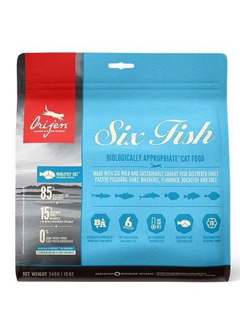 Сухий корм Orijen 6 Fish Cat & Kitten – це біологічно відповідний корм для котів усіх порід та всіх стадій життя. Високопротеїновий (40%), з обмеженою кількістю вуглеводів (16%), забезпечує живлення всіх котів на всіх стадіях життя, відповідно до їх еволюційних та біологічних потреб. Не порівняється з будь-якими іншими кормами для котів, 2/3 риби у складі Orijen є свіжою (охолодженою, без додавання консервантів) або сирою (миттєво замороженою, без додавання консервантів), включаючи топ 6 рибних інгредієнтів у складі. 1/3 – це риба, висушена за температури 90°C – концентроване джерело протеїнів з риби. Високоживильне співвідношення рибних інгредієнтів WholePrey, включаючи м'ясо риби, органи та хрящі, є природним джерелом практично всіх поживних компонентів, необхідних котам. Включення ліофілізованої печінки тріски посилюють природний аромат, роблячи ORIJEN неперевершеним вибором навіть для найвибагливіших в їжі вихованців. Склад: Свіжа тихоокеанська сардина (26%), свіжий цільний тихоокеанський хек (9%), свіжа цільна тихоокеанська макрель (8%), свіжа цільна тихоокеанська камбала (5%), свіжий цільний морський окунь (5%), свіжа (дегідратована, 5%), цілісна оселедець (дегідратована, 5%), цілісна путасу північна (дегідратована, 5%), жир з оселедця (5%), тріска (дегідратована, 5%), червона сочевиця, зелена сочевиця, зелений горошок, соняшник (дегідратована, 1.5%), клітковина сочевиці, нут, жовтий горошок, квасоля строката, печінка тріски (ліофілізована), гарбуз, мускатний гарбуз, цукіні, пастернак, морква, яблука, груші, капуста Кале, шпи журавлина, чорниця, ягоди ірги, корінь цикорію, корінь куркуми, розторопша, корінь лопуха, лаванда, корінь алтея, плоди шипшини. Добавки (1 кг): Харчові добавки: цинку хелат: 100 мг; міді хелат: 11 мг холіну хлорид: 1200 мг. Зоотехнічні добавки: Enterococcus faecium NCIMB10415: 600x10^6 ДЕЯКЕ. Енергетична цінність: 4120 ккал/кг або 535 ккал на чашку 250 мл (120 г), де джерелом 41% енергії є протеїн, 15% фрукти та овочі, 44% з жиру.
