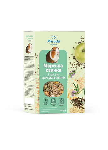 Рецептура корму «Морська свинка» розроблена на основі рекомендацій провідних фахівців з розведення гризунів. Повноцінний вітамінізований корм призначений для щоденного годування морських свинок та інших середніх гризунів. Він містить всі необхідні інгредієнти, що забезпечують правильний розвиток молодих і чудову кондицію дорослих тварин. Корм сприяє покращенню стану шерсті в ангорських та розеточних морських свинок. Крім зерна до складу суміші входять вітамінно-смакові добавки: горіхи, фрукти, вітаміни А, В1, В2, D3, E, H, Р, а також мінеральні речовини: солі кальцію, фосфору, калію, натрію. Застосування: годувати 2-3 рази на день невеликими порціями. Корм кожного разу насипати у чисту суху годівничку. Обов'язково в поїлці повинна бути свіжа вода. Склад: яблука сушені гранульовані, трав’яне борошно гранульоване в асортименті, кукурудза, овес, ячмінь, комбікорм, вівсяні пластівці, насіння соняшнику, пшениця, сочевиця.