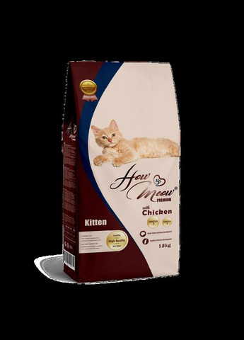 Повнораціонний корм для кошенят How Meow Adult Kitten з куркою 15 кгСухий корм How Meow - це оптимально збалансований корм для кошенят та лактуючих кішок. Цей корм містить всі необхідні елементи, вітаміни та мінерали для здоров'я зростаючого організму Вашого котика. М'ясні інгредієнти ретельно відібрані і перевірені лабораторією фабрики. Даний корм допомагає підтримувати відмінний стан шкіри та шерсті улюбленця, а також покращити роботу внутрішніх органів. Додавання таурину допомагає зміцнити серцево-судинну систему улюбленця і зберегти гостий зір. Навіть вередливий котик не залишиться байдужим.Склад: оброблений курячий білок 50%, рис, кукурудза, пшениця, курячий жир, тваринний жир, тваринний білок, пивні дріжджі, вітаміни та мінерали, пробіотики, юкка Шідігера, таурин.Добавки: Вітамін А: 15 000 МО/кг, Вітамін D: 1250 МО/кг, Вітамін С: 150 мг/кг, Вітамін Е: 100 мг/кг.Аналітичний склад: білок 32%, жир 15%, зола 8%, вологість 8%, клітковина 4%, кальцій 2%, фосфор 1%, натрій 0,5%.Вага: 15 кг
