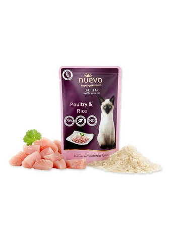 Повноцінний корм Nuevo KITTEN орієнтований забезпечення необхідними поживними речовинами для підтримки зростання кошенят. Високоякісне м'ясо птиці у поєднанні з рисом та лососевою олією забезпечує ваше кошеня всіма поживними речовинами для гарного та здорового початку життя. Склад: свійський птах 40%, курка 30%, бульйон 26,5%, рис 2%, мінерали 1%, лососева олія 0,5%. Аналітичні складові: Протеїн 10,60 %, жир 5,40 %, сира зола 2,20 %, сире волокно 0,50 %, волога 80 %, кальцій 0,25 %, фосфор 0,2 %. Харчові добавки на кг: Вітамін D3 (3a671) * 200 ОД Цинк у вигляді моногідрату сульфату цинку (3b605) * 25 мг Марганець у вигляді моногідрату сульфату марганцю (3b503) * 1,4 мг Мідь у вигляді пентагідрату сульфату міді(5) йодату кальцію (3b202) * 0,75 мг Таурін (3a370) * 1500 мг Рекомендації по годуванню: Вага Кількість до 3 кг 2 х 85 г 3-4 кг 3 х 85 г 6-7 кг 4 х 85 г