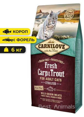 Переваги та особливості: Не містить глютену і зернових компонентів - може застосовуватися в раціоні котів з харчовою алергією або непереносимістю глютен вмістимих продутів. А також для годування тварин, схильних до утворення зайвої ваги, для стерилізованих кішок. Оптимальне співвідношення поживних речовин, корисних вітамінів, мікроелементів для максимально повного засвоєння організмом тварини і легкого перетравлення. У складі тільки свіжа риба: короп і форель, фрукти, овочі, трави і ягоди - джерела антиоксидантів і необхідних речовин для здоров'я, міцного імунітету, підтримки сечостатевої системи, активності і гарного настрою вашого кота. Склад корму: Свіжий короп без кісток (25%), сушена форель без кісток (20%), свіжий лосось без кісток (14%), сушений лосось (12%), гарбуз, курячий жир (консервований токоферолами, 4%), нут, горох, куряча печінка (3%), риб'ячий жир з лосося (2%), яблука, морква, лляне насіння, гідролізовані панцири ракоподібних (джерело глюкозаміна, 0,026%), хрящовий екстракт (джерело хондроїтину, 0,016%), пивні дріжджі (джерело мананолигосахаридів, 0,015%), корінь цикорію (джерело фруктоолігосахаридів, 0,012%), юка Шідігера (0,01%), водорості (0,01%), псілліум (0,01%), чебрець (0,01%), розмарин (0,01%), орегано (0,01%), журавлина (0,0008%), лохина (0,0008%), обліпиха крушини (0,0008%), корінь імбиру (0,0008%), шавлія (0,0008%). Вміст добавок на 1 кг: вітамін А (3a672a) 23. 000 ME, вітамін D3 (E671) 940 ME, вітамін E (?-токоферол) (3a700) 650 мг, вітамін C (3a312) 300 мг, таурин (3a370) 2. 400 мг, холінхлорид (3a890) 2. 200 мг, L-карнітин (3a910) 65 мг, ніацин (3a315) 45 мг, біотин (3a880) 1,8 мг, хелат цинку і амінокислот n-гідрат (3b606) 100 мг, хелат заліза і амінокислот n-гідрат (E1) 48 мг, хелат марганцю і амінокислот n-гідрат (E5) 55 мг, йодид калію (3b201) 3,8 мг, хелат міді і амінокислот n-гідрат (E4) 11 мг, органічна форма селену, похідне від життєдіяльності дріжджів Saccharomyces cerevisiae CNCM I-3060 (3b8.10) 0,2 мг, L-метіонін (3c305) 14 мг, аргінін (3c3.6.1. ) 12 мг, L-лізин (3.2.3.) 10 мг. Містить виключно натуральні антиоксиданти. Найменування бренду: Carnilove (Карнілав) Виробник: Карнілав, Вафо Праха с.р.о. (Карнілав, Вафо Праха с.р.о.) Країна реєстрації бренду: Чехія