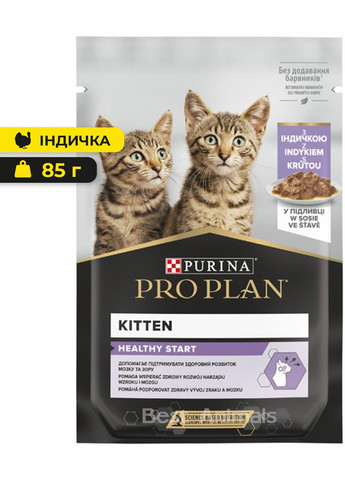 Вологий корм Purina Pro Plan Kitten Healthy Start - консервований порційний повнораціонний корм для кошенят. Він об'єднує всі необхідні поживні речовини, включно з вітаміни, а також докозагексаєнову кислоту. Сприяє підтримці розвитку мозку та зору завдяки вмісту докозагексаєнової кислоти. Забезпечує здоровому росту кісток і м'язів завдяки високому вмісту білка, а також правильному балансу поживних речовин, таких як кальцій і вітаміни. Переваги: допомагає підтримувати збалансований раціон, що забезпечує організм тварини необхідними поживними речовинами, вітамінами та мікроелементами; підтримує здоровий ріст кісток та мускулатури; має відмінні смакові якості та привабливий аромат; виготовлений із високоякісних легкозасвоюваних натуральних інгредієнтів; забезпечує здоровий розвиток життєво важливих функцій завдяки поживним речовинам, рівень яких адаптований до періоду зростання кошеняти. Рекомендації щодо годівлі: кошенятам у віці 6-12 тижнів рекомендовано давати 3,5-4,5 пакетики/день; кошенятам у віці 12-26 тижнів: 4,5-5 пакетиків/день; кошенятам у віці 26-52 тижні: 4 пакетики/день мінімум за 2 прийоми їжі. Кожне кошеня унікальне, тому добова кількість корму та/або час годівлі можуть відрізнятися залежно від рівня активності кошеняти та стану його тіла. Вагітних та лактуючих кішок годуйте за бажанням тварини. Мінімальна добова кількість для вагітних кішок - 4 пакетики, для лактуючих кішок - 6 пакетиків. Подавайте корм кімнатної температури. Свіжа, чиста питна вода повинна бути доступною тварині у будь-який час. Цей пакетик не іграшка. Для уникнення ризику травмування зберігайте його в недоступному для дітей та тварин місці. Склад: м'ясо та субпродукти тваринного походження (з яких індички 4%), екстракти рослинного протеїну, риба та продукти переробки риби, олія рослинного походження, мінеральні речовини, продукти переробки рослинного походження, цукри. Поживні кормові добавки: мг/кг(mg/kg): сульфат заліза: (Fe: 15); йодат кальцію: (I: 0,46); сульфат міді: (Cu:1,1); сульфат марганцю: (Mn:2,2); сульфат цинку: (Zn:22); таурин: 590; МО/кг(IU/kg): вітамін А: 1300; вітамін D3: 175; вітамін Е: 295; Aроматизатори. Поживні речовини: сирий протеїн: сирий протеїн: 12,5%, сирий жир: 4,0%, сира зола: 2,4%, сира клітковина: 0,3%, докозагексаєнова кислота: 0,01%. Волога: 78%. ? ?