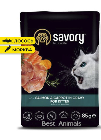 Savory — це повноцінний вологий корм супер-преміум класу, спеціально розроблений для кошенят до 1 року. Він підходить як для самостійного харчування, так і для комбінування із сухим кормом. Завдяки високому рівню вологи в кормі, він допомагає підтримувати оптимальний водний баланс, що знижує ризик засолювання і підвищення концентрації сечі, тим самим запобігаючи проблемам із сечовивідними шляхами. Чому варто придбати? Лосось: дієтичний білок з високою засвоюваністю, ідеальний для чутливих улюбленців. Лосось є джерелом Омега-жирних кислот, які підтримують здоров'я шкіри та шерсті, а також зміцнюють нервову систему Морква: багатий на вітаміни інгредієнт, що сприяє зміцненню імунітету Склад: м'ясо та продукти тваринного походження (74% у шматочках), риба та продукти рибного походження (з яких 4% лосось), овочі (1% дегідрованої моркви, що еквівалентно 4% моркви), продукти рослинного походження, екстракт рослинного білка, мінерали, цукри. Аналітичний склад: сирий білок – 9%, сирий жир – 5%, сира зола – 2,1%, сира клітковина – 0,3%, вологість – 83%. Харчові добавки на 1 кг: таурин – 1000 мг, вітамін Е – 100 мг, цинк – 10 мг, марганець – 2 мг, йод – 0,7 мг, мідь – 2 мг, залізо – 2 мг, біотин – 100 мкг, вітамін D3 – 300 МО. Енергетична цінність: 81 ккал/100 г.
