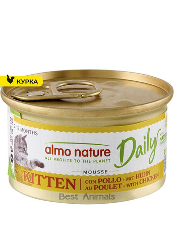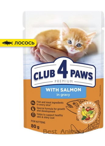Вологий корм для котенят Club 4 Paws - поживний, смачний та повноцінний раціон преміум класу для вашого вихованця. Переваги: сприяє формуванню здорових кісток та суглобів; підтримує шкіру здоровою, а шерсть блискучою; містить спеціальні компоненти для підтримки імунітету улюбленця; без штучних ароматизаторів та барвників. Рекомендації щодо вживання: порція корму має бути кімнатної температури; корм необхідно вводити до раціону поступово (принаймні протягом перших 5 днів); забезпечити тваринам постійний доступ до чистої та свіжої питної води. Зберігання: у прохолодному, сухому місці при температурі від +6?С до +30?С, корм у відкритій упаковці зберігати в холодильнику не більше 48 годин. Склад: 77 % м'яса та продуктів тваринного походження у шматочках, у т. ч. з курки 32 %, злаки, олії та жири (олія лосося 0,19 %), екстракти рослинного білка, мінерали, фрукти (банан 0,1 %, глід 0 ,03%) овочі (помідори 0,11%), імбир 0,005%. Аналітичний склад та компоненти: сирий білок – 9%, сирий жир – 8%, сира зола - 2,5%, сира клітковина – 0,3%, вологість - 78%, кальцій – 0,35%, фосфор – 0,3%, омега-3 жирні кислоти – 0,11%, омега-6 жирні кислоти – 1,02%, вітамін D3 - 267 МО/кг, вітамін Е – 21,3 мг/кг, вітамін В1 – 1,33 мг/кг, D-пантотенат кальцію – 1,33 мг/кг, фолієва кислота - 0,3 мг/кг, холін хлорид - 5,4 г, цинк (E6) – 7,35 мг/кг, марганець (Е5) – 5,46 мг/кг, йод (Е2) – 1,12 мг/кг, селен (Е8) – 0,35 мг/кг, таурин - 623 мг/кг, гліцин - 2,6 г, енергетична цінність – 467,05 кДж (111,63 ккал).
