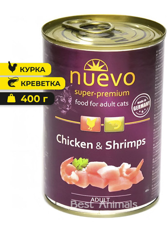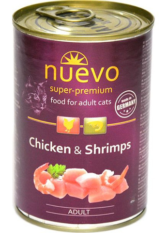 Повнораційний консервований корм для дорослих кішок, віком від 1 до 7 років. В основі рецепта Nuevo Adult – формула збалансованого харчування, яка містить білки, мінерали, вітаміни, таурин та жири тваринного походження! Особливості: Повноцінний раціон для вашого улюбленця, який поєднує високопоживний протеїн з м'яса курки, і вишукані креветки, що надають смаку і багаті на цінні жирні кислоти. , бульйон 28%, мінерали 1% Гарантований аналіз: протеїн – 11.50%, жир – 4.80%, зола – 2.30%, клітковина – 0.30%, вологість – 80%, кальцій / фосфор – 1.2 / 1, таурин – 1500 по годуванню: Вага кота 2кг - 200г/добу, 4кг - 300г/добу, 6кг - 400г/добу 36 міс - закрита / до 2 діб відкрита при температурі +5 -7С