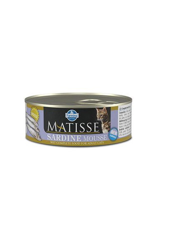 Повнораціонний вологий корм для дорослих кішок та котів.Вологі корми Matisse – повнораціонне та збалансоване харчування для дорослих кішок з нормальним рівнем фізичної активності, яке містить високоякісні інгредієнти для здорового та збалансованого харчування:Білки тваринного походження (яловичина, телятина, кролик, курка, ягня та риба) гарантують оптимальну кількість калорій та білка, та високу засвоюваність корму;Висока смакова привабливість корму;Не містить ГМО.Склад: курка, сардина (5%), оселедець, куряча печінка, гідролізований рибний білок, рис, вітаміни, мінерали.Добавки харчові на кг: вітамін А 4000 МО, вітамін D3 400 МО, вітамін Е 130 мг, таурин (800 мг/кг).Поживні речовини: волога 78,0%, сирий білок 11,0%, сира клітковина 0,5%, сира олії та жири 7,0%, сира зола 3,0 %.Енергетична цінність:EM Kcal/Kg 997,5