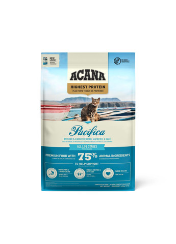 Сухий корм Acana Pacifica Cat — повнораціонний беззерновий холістик суперпреміум класу для котів усіх порід, створений з урахуванням природних потреб хижаків. Раціон багатий різноманітними видами риби, включаючи оселедець, макрель, камбалу, хек та морського окуня, виловлених у дикій природі Тихого океану. Інгредієнти представлені у співвідношенні WholePrey, що включає філе риби, органи та їстівні кістки, забезпечуючи природне харчування вашого кота. Переваги корму Acana Pacifica Cat: Поєднання високоякісних протеїнів, натуральної клітковини та суміші пробіотиків підтримує здоров’я травної системи. Високий вміст тваринного білка та низький рівень вуглеводів відповідають природному раціону кота. Різноманітність рибних інгредієнтів (оселедець, макрель, камбала, хек, морський окунь) у співвідношенні WholePrey. Свіжа регіональна риба — джерело Омега-3 жирних кислот (ДГК і ЕПК) для здоров’я шкіри та блиску шерсті. - Таурин, ЕПК, ДГК — життєво необхідні нутрієнти для здоров’я серця і очей. Низький вміст вуглеводів забезпечує повільне підвищення рівня цукру в крові, знижує чутливість до інсуліну та запобігає відкладенню жиру. Натуральні антиоксиданти та фітокомпоненти з морських водоростей, ягід і коренів рослин (цикорій, куркума, лопух, шипшина тощо) підтримують імунітет і травлення. Кожна гранула містить ліофілізовану печінку для неперевершеного смаку. Не містить зернових з високим глікемічним індексом (рис, картопля). Розмір гранул — 10 мм. Склад: Сирий тихоокеанський оселедець (14%), сирий тихоокеанський макрель (13%), сирий цільний хек (9%), дегідратований оселедець (8%), дегідратована путасу (8%), дегідратована макрель (8%), квасоля строката, горошок, сирий камбала (5%), жир минтая (5%), цільна червона сочевиця, цільний нут, цільна зелена сочевиця, сирий морський окунь (4%), соняшникова олія, клітковина сочевиці, ліофілізована печінка тріски (1%), висушена ламінарія, свіжий гарбуз, мускатний гарбуз, капуста кале, шпинат, зелень ріпи, морква, яблука, груші, журавлина, чорниця, корінь цикорію, куркума, розторопша, лопух, лаванда, алтея, шипшина. Добавки на 1 кг: Вітаміни (B1, B2, ніацин, B5, B6, фолієва кислота, біотин, B12, A, E, K1), мікроелементи (цинк, мідь), амінокислоти (DL-метіонін, таурин), холін хлорид, пробіотики (Enterococcus faecium), екстракти рослин (токоферол, лимонна кислота, розмарин). Рекомендації з годування: Норми годування залежать від віку, активності, породи та середовища утримання кота. Для кошенят після відлучення (приблизно 5 тижнів) — 1/2 мірної склянки (60 г) на 1 кг маси тіла на добу. З 20 тижнів — 1/4 мірної склянки (30 г) на 1 кг маси тіла на добу. З 52 тижнів — перехід на раціон для дорослих котів. Вагітним кішкам збільште добову норму на 25%. Під час лактації забезпечте вільний доступ до корму. Годуйте 2-3 рази на день, завжди забезпечуючи доступ до свіжої води. Зберігайте корм у сухому, прохолодному місці в закритому пакуванні. Цей корм забезпечує збалансоване, натуральне харчування, яке підтримує здоров’я, енергію та активність вашого кота.