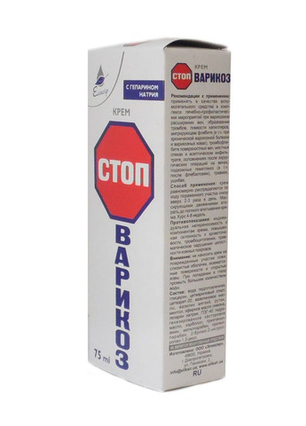 Крем СТОП-Варикоз застосовується в якості допоміжного засобу в комплексі лікувально-профілактичних заходів при варикозному розширенні вен, утворенні тромбів, ламкості капілярів, мігруючому флебіті (в т.ч. при хронічній варикозній хворобі та варикозних виразках). асептичному інфільтраті, ускладненнях після хірургічних операцій на венах, підшкірних гематомах (в т.ч. після флебектомії), травмах, забитих місцях. при болючих відчуттях у венах; при застої крові; при виникненні набряклості ніг та венозного малюнка на шкірі; при болях після травм, синців, ударів. Крем «СТОП-Варикоз» містить активні речовини, які мяко, ефективно та різнобічно впливають на джерело болю. Склад: вода підготовлена, гліцерин, цетеариловий спирт, цетеарет-20, вазелінове масло, вазелін мякий, рутин, ментол, ефірна олія лимона, гепарин натрію, ПЕГ-40 гідрогенізована касторова олія, карбопол, триетаноламін, метилпарабен, пропілпарабен, 2 2-нітропропан-1,3-діол. Спосіб застосування: крем рівномірно розподіляється по ходу ураженої ділянки знизу нагору 2-3 рази на день. Масажуючими рухами втирати до повного вбирання крему. Курс 4-8 тижнів. індивідуальна непереносимість до компонентів крему, підвищена схильність до кровоточивості, тромбоцитопенія, травматичне порушення цілісності шкірних покривів. Увага: не наносити крем на пошкоджені ділянки шкіри, слизові оболонки, екзематичні поверхні та відкриті виразки. При попаданні у вічі промити великою кількістю води. Умови зберігання: зберігати в сухому, захищеному від світла місці при температурі від +5С до +25С. Термін придатності до споживання: 24 місяці від дати виготовлення. Виготовлено в Україні: ДСТУ 4765-2007 Якість гарантуємо !!!