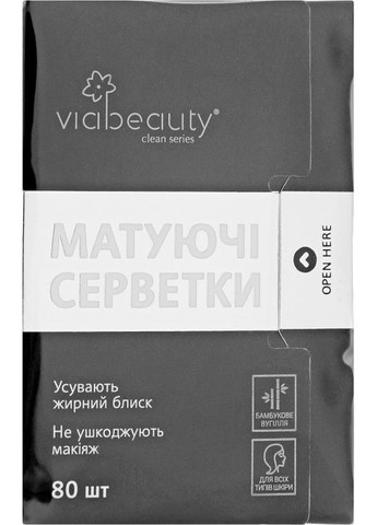 Протягом усього дня наша шкіра продукує певну кількість шкірного жиру. Часом блиск стає надмірним і шкірі потрібна допомога в його швидкому та ефективному усуненні. У цьому вам сприятимуть матувальні серветки для обличчя. Бренд Via Beauty подбав про те, щоб ви могли прибрати зайвий блиск у Т-зоні та водночас не порушити цілісність вашого тонального покриття. Серветки просочені антибактеріальним складом, що дає змогу позитивно впливати на жирний тип шкіри, підсушувати запалення й забезпечити матувальний ефект. Відтепер вам не потрібно буде покривати обличчя черговим шаром пудри та обтяжувати шкірний покрив декоративними засобами, адже матувальні серветки завжди будуть під рукою! Особливості матувальних серветок для обличчя від Via Beauty:- в упакуванні ви знайдете 100 виробів;- вони швидко та ефективно всотують надлишки себуму, усувають пил, дрібний бруд;- вирізняються бездоганним очищувальним ефектом;- уповільнюють розмноження бактерій завдяки антисептичним і підсушувальним властивостям;- серветки одноразові, зберігаються в герметичному упакуванні, що робить їх 100 % гігієнічними.