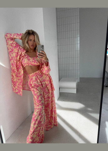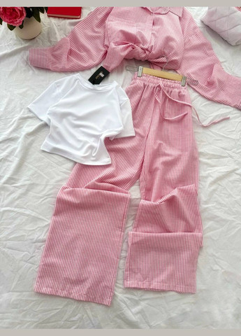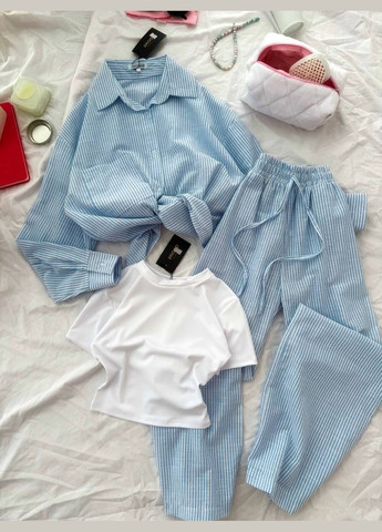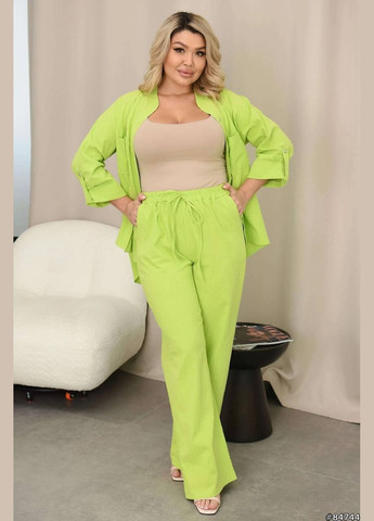 Костюм із натуральної тканини льон жатка — ідеальне поєднання стилю, зручності та природного шику. Комплект складається з вільних штанів на резинці з куліскою для зручної посадки та сорочки вільного крою з довгими рукавами, які можна підкочувати і фіксувати хлястиками.
