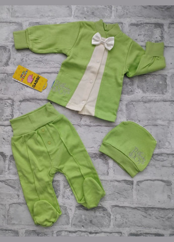 Дитячий комплект для хлопчика *Кнопа* (3 предмети) – яскраве вбрання для маленької кнопки. У комплект для хлопчика *Кнопа* входять такі предмети, як сорочечка, повзунки на широкій резинці та шапочка. Сорочка має застібку у вигляді чотирьох кнопок – дві з одного боку і дві з іншої, манжети-перчатки надійно закривають ручку дитини. Спереду сорочечка прикрашена малюнком у вигляді зображення левеня і напису *Бій*. Повзунки з глибокою посадкою на памперс з малюнком у вигляді напису такий самий, як і на сорочці. Шапочка трапецієподібної форми з малюнком у вигляді кольорового яскравого напису *Бій*. Дитячий комплект для хлопчика *Кнопа* (3 предмети) ніжний та приємний на дотик, завдяки використаній ажурній тканині – Мультиріп. Вироби з мультирипу мають високі гіпоалергенні властивості, невибагливі у догляді і не втрачають свого зовнішнього вигляду на всьому протязі терміну використання.розмір 56: