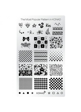 Опис Пластина для стемпінгу - Konad The Most Popular Pattern Красиві декоративні візерунки на нігтях вже давно ввійшли в моду і стали справжньою класикою серед представниць прекрасної статі, а стемпінг вже давно є прекрасним доповненням до будь-якого манікюру. Фахівці популярного косметичного бренда Konad вже багато років створюють якісні товари для нігтів. Однією з розробок компанії стала оригінальна пластина з нанесеними на неї трафаретами для виконання стемпінгу. Тут ви зможете знайти безліч візерунків і малюнків для нігтьової пластини, тому експериментувати з манікюром можна буде дуже довго. Усі малюнки мають оригінальний дизайн. Цю пластину можна використовувати як у домашніх умовах, так і для роботи в салоні. Потіште себе вигідним і красивим придбанням. Спосіб застосування: нанесіть лак Konad на обраний малюнок на пластині. Шкребком від Konad видаліть надлишки лаку з пластини, швидким рухом натисніть штампом Konad на пластину, щоб скопіювати малюнок. Нанесіть на нігті відбиток малюнка легким протягувальним рухом або просто швидко притисніть печатку на одну секунду. Після кожного використання очищайте печатку і пластину засобом для зняття лаку.