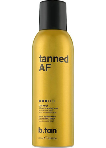 Готові зануритися у світ розкішної засмаги та сяйва? Бронзувальний спрей для автозасмаги «Tanned Af» від бренда B.tan подарує вам бажаний результат, який матиме природний вигляд, ніби ви щойно повернулися з пляжу. Засіб має ефективну формулу, яка дає змогу досягти гарного відтінку вже за 1 годину. Однак для глибшого й насиченішого кольору варто просто залишити спрей на тілі до 4 годин, і ви будете в захваті від результатів. Склад багатий на натуральні олії аргани, макадамії, жожоба, шипшини, винограду, авокадо, а також екстракт огірка та вітамін С. Вони живлять, зволожують і пом'якшують вашу шкіру, роблячи її не лише візуально привабливою, але й здоровою. Особливості B.tan Self Tan Bronzing Cпрей: – комплекс натуральних олій піклується про комфорт і здоров’я шкіри, поліпшує її текстуру;– надійно захищає від зневоднення, відчуття стягнутості, свербежу, лущення;– забезпечує видимий ефект за 1 годину, інтенсивний темний колір — за 4 години;– легка формула рівномірно розподіляється по тілу, не створюючи розводів;– приємний аромат дарує додаткове задоволення від використання;– не містить продуктів тваринного походження;– швидко висихає, не залишаючи слідів на речах;– допоможе здобути гарну бронзову засмагу.