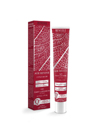 Нічний крем-концентрат для обличчя Revuele Age Revive Night Cream-Concentrate - ефективне доглядає засіб, призначений для інтенсивного догляду за зрілою шкірою. Активний комплекс продукту збагачений рослинними інгредієнтами, які проникають у глибокі шари епідермісу, насичують клітини корисними регенерації, а також надають шкірі пружність, шовковистість та здорове сяйво. Активна формула крему має пом'якшуючі та зволожуючі властивості, тому усуває сухість, лущення та почервоніння. Засіб нейтралізує вплив вільних радикалів, прискорює синтез еластину та колагену, стимулює клітинний метаболізм та розгладжує мікрорельєф епідермісу, покращує колір обличчя та тонізує шкірний покрив. Спосіб застосування Увечері нанести достатню кількість крему на очищену шкіру обличчя та легкими масажними рухами втерти до повного поглинання. Склад Aqua, Glyceryl Stearate, Butyrospermum Parkii (Shea Butter), Paraffinum Liquidum, Cetearyl Alcohol, Glycerin, Caprylic/ Capric Triglyceride, Ceteareth-20, Ceteareth-12,Cetyl Palmitate, Polydimetylsiloxane(Dimethicone), Rhododendron Ferrugineum Leaf Cell Culture Extract (and) Isomalt (and) Lecithin (and) Sodium Benzoate (and) Lactic Acid, Phenoxyethanol, Parfum, Acrylates/C10-30 Alkyl Acrylate Crosspolymer, Triethanolamine, Ubiquinone, Allantoin, BHT.