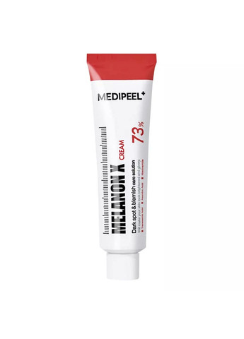 Високоефективний відбілюючий крем цілеспрямовано діє проти всіх видів пігментації: постакне, веснянок, вікових пігментних плям. Крем містить 5 видів відбілюючих інгредієнтів, які борються з вже наявними порушеннями пігментації шкіри і пригнічують вироблення меланіну, тим самим перешкоджаючи появі нових осередків. До активнодіючих речовин відносяться: Ніацинамід вітамінізує шкіру та прискорює її регенерацію, підвищує еластичність і бар'єрну функцію, ефективно вирівнює поверхню шкіри, освітлює вікові пігментні плями і постакне. Вітамін С - потужний антиоксидант, перешкоджає старінню шкіри, зменшує вироблення меланіну, бореться з пігментацією. Має також антибактеріальний ефект, підвищує імунітет шкіри, і стимулює процеси регенерації, що робить його незамінним при лікуванні акне. Комплекс 5 пептидів блокує руйнування молекул колагену і еластину в клітинах епідермісу, завдяки чому сповільнюються процеси старіння, повертає шкірі еластичність і пружність, підтримує водний баланс, відновлює пошкоджені ділянки. Масло ши (каріте) захищає від УФ-променів, пом'якшує шкіру, активізує процеси регенерації, стимулює синтез колагену, в результаті шкіра стає пружною, розгладжуються дрібні зморшки. Гіалуронова кислота має маленьку молекулу, яка проникає в глибокі шари епідермісу і утримує там необхідну кількість вологи, сприяє вирівнюванню рельєфу шкіри, надає їй здоровий, сяючий вигляд. Екстракт гамамелісу зміцнює стінки кровоносних судин, звужує пори, регулює роботу сальних залоз, має антисептичну та протигрибкову дію, ефективний проти будь-яких запальних процесів і акне. Арбутин на цей момент один найефективніших речовин, спрямованих на пригнічення вироблення меланіну в шкірі. Аргінін має антивіковий ефект, сприяє регенерації клітин шкіри, активізує кровообіг допомагаючи корисним компонентам проникати в глибокі шари епідермісу. Аденозин стимулює вироблення колагену, перешкоджає старінню шкіри, пом'якшує і підтягує її. Крем MEDI PEEL Tranex Mela X Cream має доведену ефективність. Він пройшов клінічні дослідження, не викликає алергії і звикання. Засіб має легку текстуру і підходить всім типам шкіри. Спосіб застосування: очистіть обличчя звичним способом, нанесіть необхідну кількість крему на проблемні ділянки шкіри. Об'єм: 30 мл
