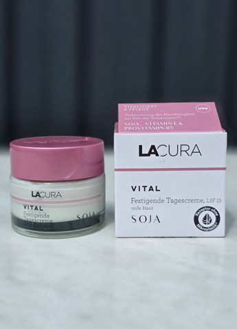 Денний крем для обличчя Lacura Vital Soya LSF 15 50 мл – спеціально розроблений для зрілої шкіри, яка потребує підтримки пружності, зволоження та захисту від сонця. Формула з фітосоєю (екстракт сої) стимулює природне оновлення клітин, допомагає зменшити глибину зморшок, покращує еластичність і тон шкіри. Сонцезахисний фільтр SPF 15 захищає від щоденного впливу УФ-променів та передчасного старіння. ✔ Фітосоя – для зміцнення та еластичності шкіри ✔ SPF 15 – щоденний захист від UV ✔ Зволожує, живить, зменшує зморшки ✔ Підходить для зрілої та сухої шкіри ✔ Об'єм: 50 мл Спосіб використання: Наносити вранці на очищену шкіру обличчя та шиї легкими масажними рухами. Рекомендується використовувати щодня.