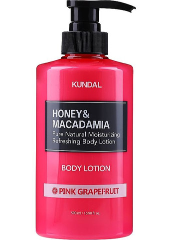 Опис Лосьйон для тіла "Рожевий грейпфрут" - Kundal Honey & Macadamia Pink Grapefruit Body Lotion Лосьйон для тіла «Рожевий грейпфрут» корейського бренда Kundal - це не просто якісний догляд за шкірою, це справжній вибух емоцій і яскравих відчуттів, який подарує гарний настрій, зарядить бадьорістю і впевненістю в собі. А все завдяки приголомшливому цитрусовому аромату, який пробуджує почуття. Вхідні ж до складу засобу натуральні олії й екстракти подбають про те, щоб ваша шкіра набула ніжність і гладкість шовку, мала красивий і доглянутий вигляд. Особливості Honey & Macadamia Pink Grapefruit Body Lotion бренда Kundal: - консистенція, яка швидко вбирається і не залишає відчуття липкості чи стягнутості;- формула збагачена екстрактами меду, центелли, розмарину, лаванди, зеленого чаю, оліями макадамії, жожоба, соком алое вера й іншими рослинними екстрактами;- надає інтенсивну зволожувальну дію, позбавляючи від сухості і лущення;- насичує шкіру потрібними поживними речовинами;- активізує процеси регенерації і загоєння пошкоджених ділянок;- надає шкірному покрову м'якість, гладкість і шовковистість, підвищує його пружність і тонус;- створює захисний бар'єр, вберігає від несприятливого впливу різних зовнішніх факторів;- має підбадьорливий цитрусовий аромат. Спосіб застосування легкими, масажними рухами нанесіть лосьйон на попередньо очищену шкіру до повного всмоктування. Склад Water, Glycerin, Cetyl Ethylhexanoate, Caprylic/Capric Triglyceride, Niacinamide, Glyceryl Stearate, Cetearyl Alcohol, Aloe Barbadensis Leaf Extract, Honey Extract, Macadamia Ternifolia Seed Extract, Avena Sativa (Oat) Kernel Extract, Salvia Officinalis (Sage) Leaf Extract, Chamomilla Recutita (Matricaria) Flower Extract, Centella Asiatica Extract, Propolis Extract, Royal Jelly Extract, Angelica Gigas Root Extract, Morus Alba Bark Extract, Sophora Flavescens Root Extract, Phormium Tenax Extract, Rosmarinus Officinalis (Rosemary) Extract, Camellia Sinensis Leaf Extract, Lavandula Angustifolia (Lavender) Extract, Glycyrrhiza Glabra (Licorice) Root Extract, Illicium Verum (Anise) Fruit Extract, Portulaca Oleracea Extract, Adansonia Digitata Seed Extract, Aloe Barbadensis Leaf Juice, Camellia Japonica Flower Extract, Hamamelis Virginiana (Witch Hazel) Extract, Arachis Hypogaea (Peanut) Oil, Simmondsia Chinensis (Jojoba) Seed Oil, Limnanthes Alba (Meadowfoam) Seed Oil, Camellia Japonica Seed Oil, Microcrystalline Wax, Polyglyceryl-3 Methylglucose Distearate, Cetearyl Olivate, Sorbitan Olivate, Butylene Glycol, Hydroxyacetophenone, Caprylyl Glycol, Carbomer, Arginine, Xanthan Gum, Dipotassium Glycyrrhizate, Adenosine, Disodium EDTA, 1,2-Hexanediol, Fragrance, Citral, Limonene, Hexyl Cinnamal, Linalool