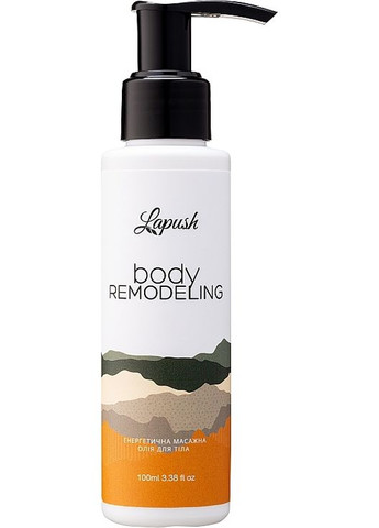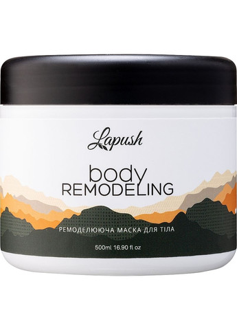 Ремоделювальна маска для тіла від бренда Lapush – чудове доповнення до виснажливих дієт, надмірних фізичних навантажень, спрямованих на ліквідацію жирових відкладень, боротьбі зі зайвою вагою. Body Remodeling пришвидшує обмінні процеси, кровообіг, водночас поліпшуючи зовнішній вигляд шкіри, чудово адаптуючись до потреб усіх її типів. Оксамитова консистенція виводить шлаки, токсини, ліквідує ознаки дегідратації, коригує видимість передчасних вікових змін, сповільнюючи їхнє наступне утворення. До того ж, цей засіб дарує тривале відчуття свіжості та прохолоди задовго після обгортання. Особливості Body Remodeling від Lapush: - виготовлена на основі з грязі та натуральних компонентів;- густа консистенція рівномірно наноситься, не розтікаючись;- сприяє зменшенню жирових відкладень в області живота й талії;- виводить шлаки, токсини, зайву вологу;- стимулює кровообіг, обмінні процеси, регенерацію шкіри;- робить її більш гладкою, еластичною і пружною;- какао вирівнює відтінок, ліквідуючи тьмяність, пігменті плями;- активно бореться зі м’язовим напруження, адже тонізує та освіжає;- дарує тривале відчуття прохолоди задовго після використання;- містить екстракт чорного перцю – сильний антиоксидантний компонент;- протидіє вільним радикалам – провісникам фотостаріння;- збагачена органічними водоростями, зокрема – захисною ламінарією;- стимулює регенерацію тканин, клітинне оновлення епідермісу;- витяжка солодкого мигдалю зміцнює його захисний бар’єр, ліпідну мантію;- перешкоджає трансепідермальній втраті води;- запобігає повторні появі ознак дегідратації, слідів утоми;- каштан вражає заспокійливими, протизапальними перевагами;- потовщує стінки капілярних судин;- ефірна олія лимону прибирає вугрові висипи, чорні цятки;- розчиняє вміст забитих пор, прискорює їхнє звуження, зменшує видимість.