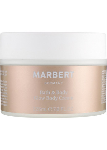 Крем для тіла Marbert Bath & Body Glow – це насичений коктейль з натуральних компонентів і золотистих світловідбивальних мікрочасточок, який допоможе вам відчути себе справжньою зіркою! Щільна текстура засобу відновлює рН-баланс епідермісу після ванних процедур і негативних впливів факторів довкілля, надаючи шкірі шовковистість і пружність. Живильні масло ши і олія жожоба позбавляють від сухості і лущення. Олія солодкого мигдалю стимулює природний синтез «білків молодості» – колагену і еластину, що підвищують тонус шкіри. Олія авокадо надає пом'якшувальну і протизапальну дію, а олія виноградних кісточок стимулює процеси регенерації. Після застосування продукту шкіра набуває делікатний блиск, завдяки якому ви матимете чарівний вигляд в сукні з відкритими плечима, у променях сонця і ритмічному мерехтінні стробоскопів. Особливості Marbert Bath & Body Glow Body Cream: - нормалізує рН-баланс і зволожує шкіру;- пом'якшує огрубілі ділянки (лікті, коліна, руки);- дарує шкірі делікатне золоте сяйво;- підвищує пружність і еластичність;- стимулює процеси регенерації;- захищає епідерміс від негативного впливу сонця, вітру і морозу.