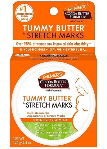 Щоб захистити тіло від розтяжок, які можуть виникати внаслідок змін розміру, варто застосовувати спеціально розроблене тверде масло бренду Palmer's. Воно призначене для догляду за шкірою під час і після вагітності, під час активного схуднення, а також у разі надмірної сухості і в'ялості. Забезпечує інтенсивне живлення, усуває подразнення і свербіння, а також створює невидимий бар'єр, що захищає від появи розтяжок. Формула збагачена маслом какао, олією соняшнику, кукурудзи й натуральним воском. Запатентований комплекс Bio C-Elaste з екстрактом центелли азіатської, гідролізованим колагеном, оліями арганії і мигдальним маслом сприяє щільності шкіри, зміцнює стінки судин і активує мікроциркуляцію. Олія лаванди і вітамін Е чинять заспокійливий і зволожувальний уплив, підтримують гідроліпідний баланс. Увага: під час вагітності підвищується чутливість шкіри. У разі появи ознак подразнення припиніть використовувати засіб.
