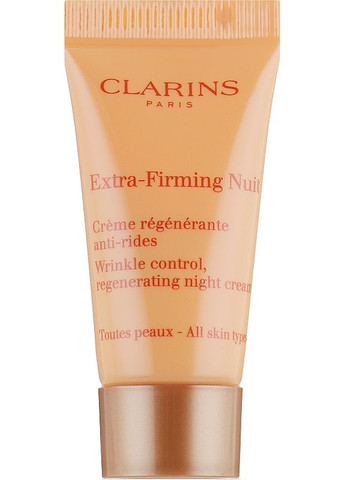 Опис Нічний крем Clarins Extra - Firming Night All Skin Types — косметичний засіб для нічного догляду за шкірою обличчя усіх типів від 40 років. Завдяки активній дії комплексу активних інгредієнтів забезпечує інтенсивне зволоження і живлення шкірного покриву, стимулює процеси регенерації клітин, дарує моментальний ефект ліфтинга, розгладжує зморшки і зміцнює структуру шкіри. Нічний крем Extra - Firming перешкоджає руйнівній дії вільних радикалів, покращує пружність і еластичність шкірного покриву, надає гладкість, шовковистість і сяйво. Цей додатковий засіб до комплексу Extra - Firming Jour, завдяки якому розгладжуються зморшки, контури обличчя стають чіткішими, а шкіра — доглянутою і здоровою. Крем, створений експертами знаменитого французького бренда Clarins, перешкоджає забрудненню шкіри, вирівнює її колір і тон, а при регулярному застосуванні подовжує молодість. Спосіб застосування наносити на обличчя і шию кожен вечір після зняття макіяжу. Склад Aq/Water, Caprylic/Capric Triglyceride, Cetearyl Isononanoate, Glycerin, Dicaprylyl Carbonate, Cetearyl Alcohol, Hydrogenated Coco-Glycerides, Butyrospermum Parkii (Shea) Butter, Glyceryl Stearate, PEG-100 Stearate, Propanediol, Hydroxyethyl Acrylate/Sodium Acryloyldimethyl Taurate Copolymer, Cetearyl Glucoside, Phenoxyethanol, Caprylyl Glycol, Parfum/Fragrance, Disodium EDTA, Ethylhexylglycerin, Tocopheryl Acetate, Caprylhydroxamic Acid, Anigozanthos Flavidus Extract, Betaine, Sorbitol, Butylene Glycol, Diospyros Mespiliformis Leaf Extract, Maltodextrin, Tromethamine, Sanicula Europaea Extract, Kalanchoe Pinnata Leaf Extract, Balanites Roxburghii Seed Oil, Mitracarpus Scaber Extract, Sodium Benzoate, Citric Acid, Hydrated Silica, Lapsana Communis Flower/Leaf/Stem Extract, Furcellaria Lumbricalis Extract, Potassium Sorbate, Maris Sal/Sea Salt/Sel Marin