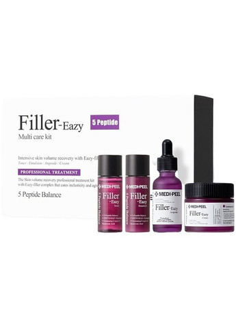 Опис Набір Склад набору: Тонер - Medi Peel Filler Eazy Toner, 30 мл + Емульсія - Medi Peel Filler Eazy Emulsion, 30 мл + Сироватка від зморщок - Medi-Peel Filler Eazy Ampoule, 30 мл + Крем - Medi Peel Filler Eazy Cream, 50 мл. Перенесіть догляд за шкірою на новий рівень з набором Eazy Filler Multi Care від бренда Medi-Peel. Він містить чотири інноваційні засоби для відновлення об'єму й еластичності шкіри. Цей професійний комплект, заснований на комплексі Eazy-Filler, складається з тонера, емульсії, сироватки й крему, що ефективно борються з ознаками старіння, відновлюючи свіжість і сяйво епідермісу. Завдяки всебічному підходу ці засоби забезпечують глибоке зволоження і підтримку еластичності, відновлюють здоровий, молодий вигляд. Тонер - Medi Peel Filler Eazy Toner - видаляє залишки макіяжу і глибоко очищає пори;- відновлює кислотно-лужний баланс шкіри;- проявляє зволожувальні й живильні властивості;- запобігає відчуттю стягнутості й сухості;- покращує пружність епідермісу. Емульсія - Medi Peel Filler Eazy Emulsion - чинить гідратаційну дію;- готує обличчя до подальшого догляду;- не створює відчуття обтяження;- активізує процеси відновлення;- сприяє візуальному омолодженню шкіри. Сироватка від зморщок - Medi-Peel Filler Eazy Ampoule - бореться з віковими змінами й втратою тургору шкіри;- чинить зволожувальну дію;- робить епідерміс гладеньким і пружним;- заповнює і пом’якшує зморшки;- активізує регенерацію клітин;- містить інгредієнти PHA й аквапорин, які усувають ороговілі часточки;- стимулює шкірну природну оновлювальну здатність;- проявляє зміцнювальні властивості;- підвищує шкірний тонус;- заспокоює подразнення, вирівнює тон. Крем - Medi Peel Filler Eazy Cream - розроблений для боротьби з втратою пружності й тонусу шкіри;- надає їй пружності й м'якості, забезпечуючи видимі результати вже після перших застосувань;- містить п'ять видів гіалуронової кислоти, що забезпечують ефект глибокого зволоження;- сприяє посиленню еластичності;- робить епідерміс пружним і гладеньким;- запобігає появі подразнень;- проявляє протизапальні й антивікові властивості;- зменшує видимість зморщок і почервоніння;- захищає від негативного впливу вільних радикалів. Спосіб застосування Крок 1 Тонер: Після очищення акуратно нанесіть текстуру зсередини на зовнішню поверхню шкіри, начебто протираєте. Крок 2 Емульсія: після використання тонеру візьміть необхідну кількість і обережно нанесіть його на все обличчя зсередини та зовні по шкірі. Крок 3 Сироватка: Після використання емульсії візьміть відповідну кількість і знову нанесіть на проблемну ділянку. Крок 4 Крем: На останньому етапі догляду за шкірою візьміть необхідну кількість і обережно розподіліть по всьому обличчю. Склад Medi-Peel Filler Eazy AmpouleWater, Glycerin, Butylene Glycol, Propanediol, Dipropylene Glycol, Pullulan, Niacinamide, 1,2-Hexanediol, Saccharomyces/Rice Ferment Filtrate, Panthenol, Carbomer, Polyglyceryl-10 Laurate, Tromethamine, Punica Granatum Fruit Extract, Morus Alba Fruit Extract, Ginkgo Biloba Nut Extract, Ficus Carica (Fig) Fruit Extract, Pentylene Glycol, Ethylhexylglycerin, Xanthan Gum, Adenosine, Disodium EDTA, Glyceryl Glucoside, Gluconolactone, Rice sh-Oligopeptide-1, Sodium Hyaluronate Crosspolymer, Hydrolyzed Glycosaminoglycans, Sodium Hyaluronate, Sodium Lactate, Benzyl Glycol, Salvia Sclarea (Clary) Extract, Polysorbate 20, Lavandula Angustifolia (Lavender) Flower Extract, Hyacinthus Orientalis (Hyacinth) Extract, Chamomilla Recutita (Matricaria) Flower Extract, Centaurea Cyanus Flower Extract, Borago Officinalis Extract, Hydrolyzed Hyaluronic Acid, Sodium Acetylated Hyaluronate, Palmitoyl Tripeptide-1, Copper Tripeptide-1, Acetyl Hexapeptide-8, Palmitoyl Tetrapeptide-7, Oligopeptide-32, Oligopeptide-29, Hyaluronic Acid, Palmitoyl Pentapeptide-4, Fragrance. Medi Peel Filler Eazy CreamWater, Butylene Glycol, Glycerin, Caprylic/Capric Triglyceride, Niacinamide, Glycereth-26, 1,2-Hexanediol, Cyclohexasiloxane, Dipentaerythrityl Hexa C5-9 AcidEsters, Betaine, Palmitic Acid, Saccharomyce