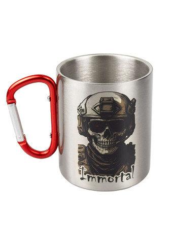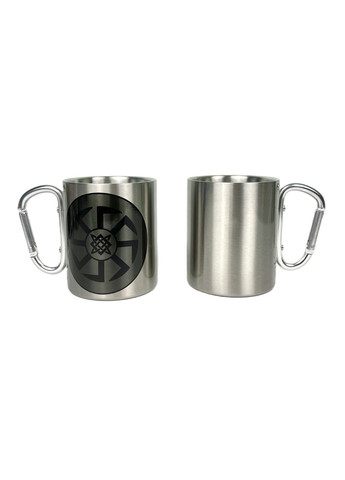 Особливість моделі — срібний карабін-ручка, який легко фіксується та дозволяє прикріпити кружку до рюкзака, пояса або екіпірування. На поверхні нанесено малюнок методом сублімації — якісний та зносостійкий друк, який не стирається з часом і не боїться води.